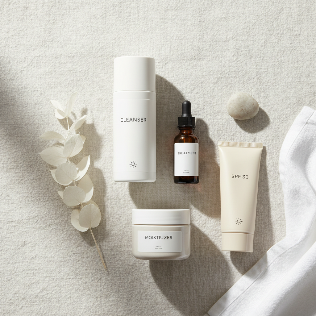 [Image suggestion: Flat‑lay of a small, coordinated set of skincare products (cleanser, treatment, moisturizer, SPF) with labels showing simple steps like 1, 2, 3, 4.]