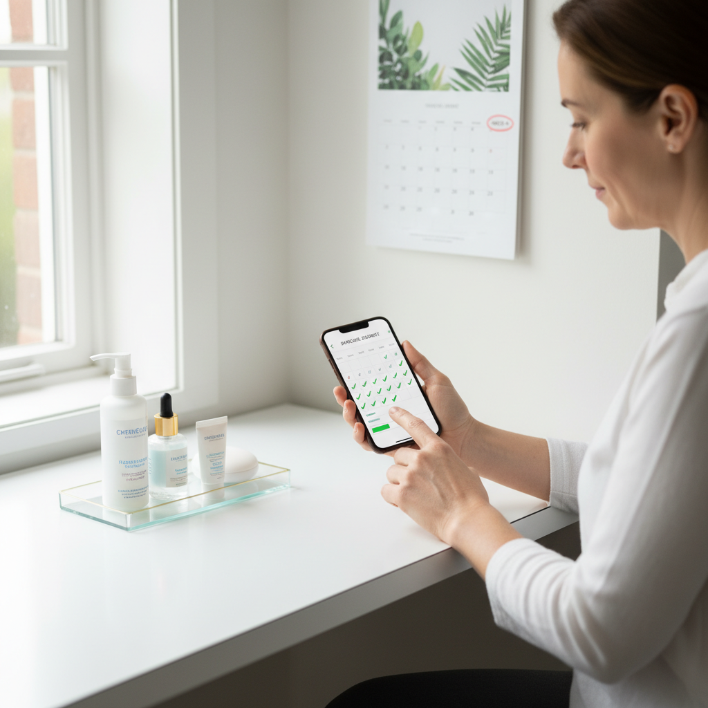 [Image suggestion: A person marking a calendar or using a skincare tracking app, with a small, consistent lineup of products beside them, emphasizing routine and progress.]